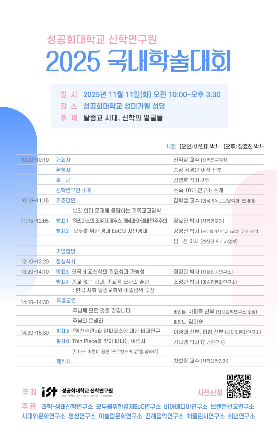 신학연구원(원장 신익상 교수)이 주최하는 이번 행사는 성공회대학 소속 10개 연구소(과학-생태신학·비아메디아·브랜트선교·시대와문화·영성·이슬람문화·전례음악·채플린시·희년·모두를위한경제EoC)가 공동으로 마련한 자리로, “탈종교 시대에 신학이 어떤 얼굴로 서 있을 것인가”를 묻는 자리이다.
